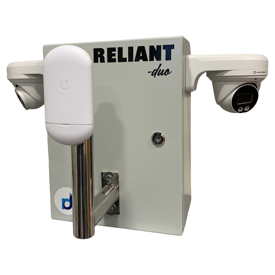Our Reliant Duo is designed to provide rugged surveillance coverage for remote areas that have electrical power but no hardwired internet nearby. The wireless backhaul antenna connects to its uplink partner on your home and brings the camera feeds straight to your mobile phone and in-home DVR. Ideal for livestock feed lots or similar applications.